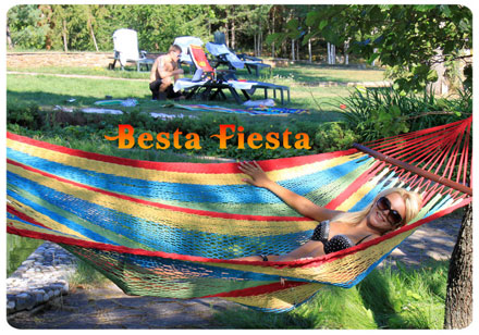Размер полотна, см: 230х110 Общая длина, см: 290 Вес гамака, кг: 3 Выдерживаемый вес, кг: 140 Цвет: красно-голубой Материал: хлопок Производитель: Besta Fiesta