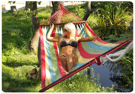 Яркий полосатый гамак MEXICO придется по вкусу всем, кто ценит высокое качество. Выполненный из хлопка гамак очень приятен на ощупь, не липнет к коже в жаркую погоду, гигиеничен и комфортен. Плетеная ткань прекрасно пропускает воздух и отлично тянется. К тому же хлопок обеспечивает гамаку необходимую прочность полотна, комфортный отдых в самую жаркую погоду. Полотно гамака сплетено вручную, эластичные нити легко тянутся, принимая форму вашего тела и обеспечивая максимум удобства.