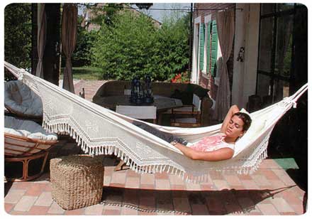 Необыкновенно стильный большой гамак «Merengue», ручная работа, хлопковая фактура материала прекрасно адаптируется к форме вашего тела, полотно гамака украшено изящной бахромой, сделанной в цвет полотна гамака и сплетенной из волокон настоящего бразильского ореха. • Такой формы гамак — это традиционно исконно южно-американский вариант гамака, «правильно» и удобно лежать в этих гамаках по полудиагонали. • Гамак «Merengue» дарит прекрасные возможности отдохнуть расслабиться в тени деревьев или на солнышке, в саду или на даче, вдвоем или в одиночестве, а также стать дизайнерской изюминкой вашего интерьера. Полотно гамака, см: 240х165 Общая длина, см: 380 Вес гамака, кг: 2 Выдерживаемый вес, кг: 180 Цвет: белый Материал: хлопок 100% Производитель: Besta Fiesta