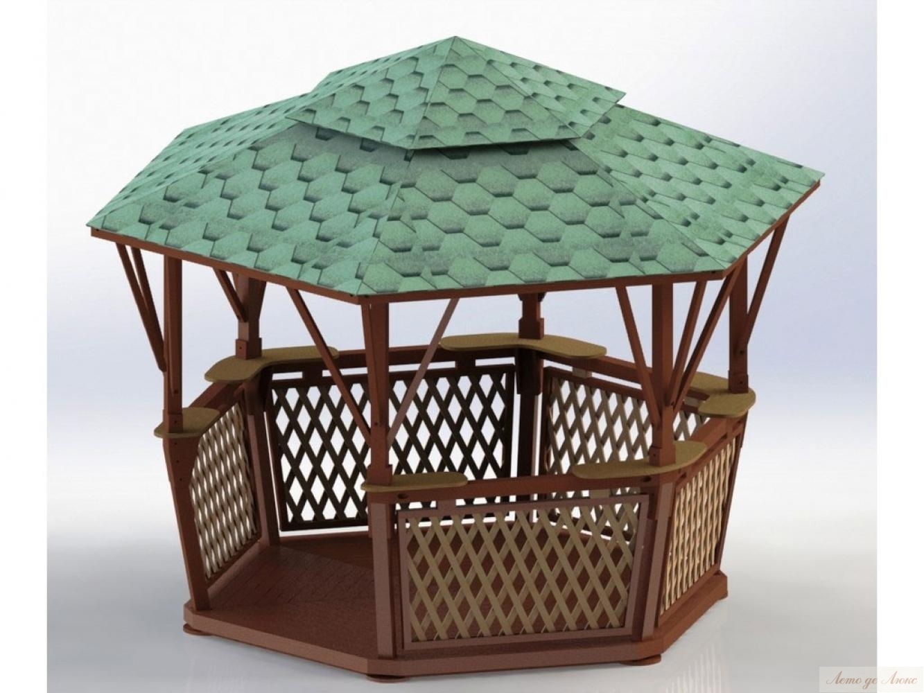 Новая деревянная беседка «Сиеста 2» стала представительницей нового модельного ряда беседок нашего производства. Основание беседки — набор из деревянных сегментов, в совокупности представляет собой шестиугольник. Крыша беседки «Сиеста 2» изготовлена по схожей технологии с беседками «Грация L» и «Грация XL», в изготовлении которых мы используем гибкую битумную черепицу. Возможны различные варианты цветов крыш (уточняйте у наших менеджеров). В оформлении беседки используются деревянные решетки. Для внутреннего оформления беседки Вы можете приобрести у нас мебель, также представленную в нашем каталоге. ХарактеристикиВысота, см 318,2 Диаметр по кровле, см 409,3 Диаметр по перилам, см 328,9 Диаметр основания, см 296